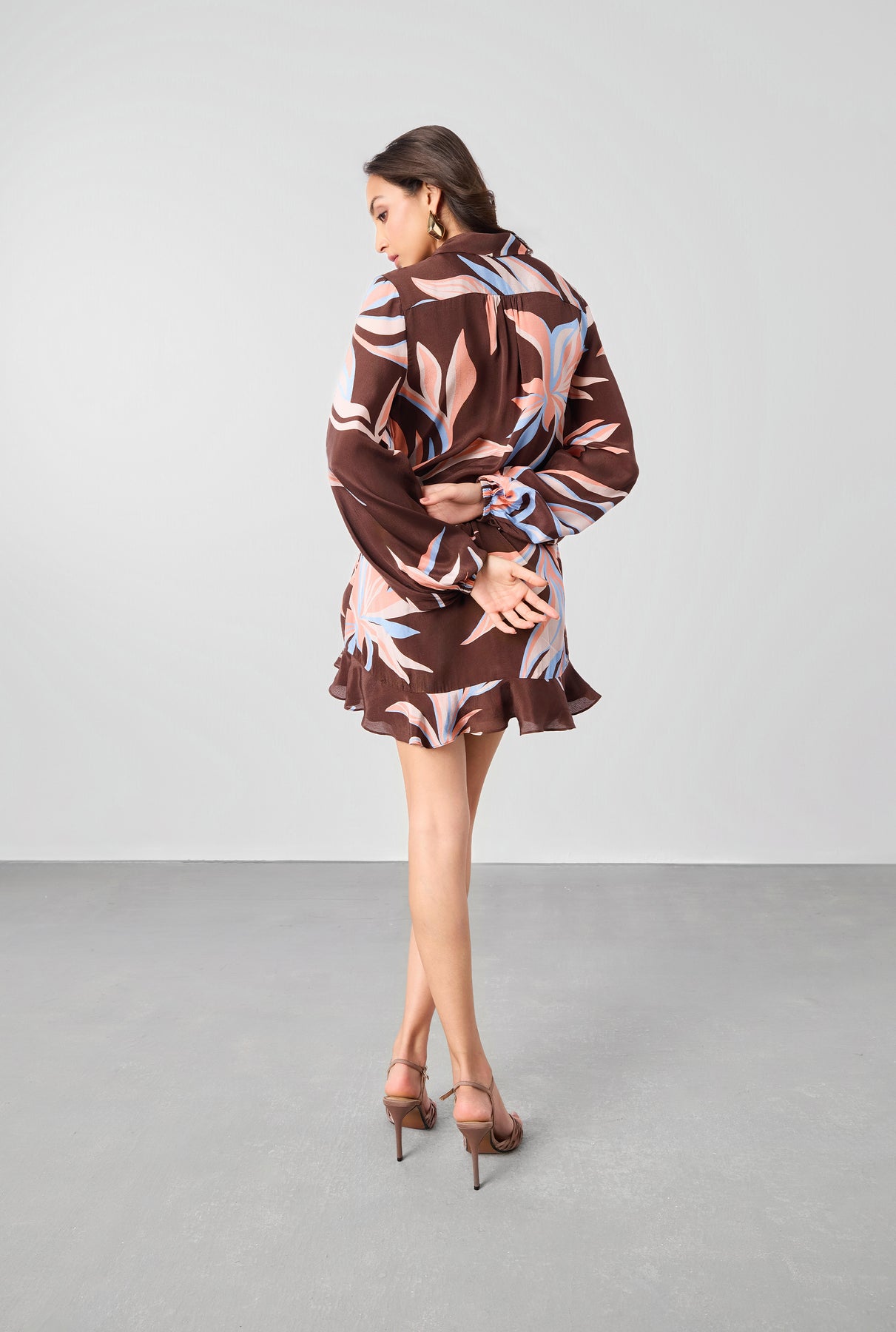 Marked by an abstract leaf print, the Fern Mini Dress from Resort ’26 offers effortless resort charm. Crafted in brown viscose, it features a collared, overlapped V-neck, blouson sleeves with elasticated cuffs, and a fully lined, relaxed slip-on fit. Perfect for sunlit days and easy evenings away.