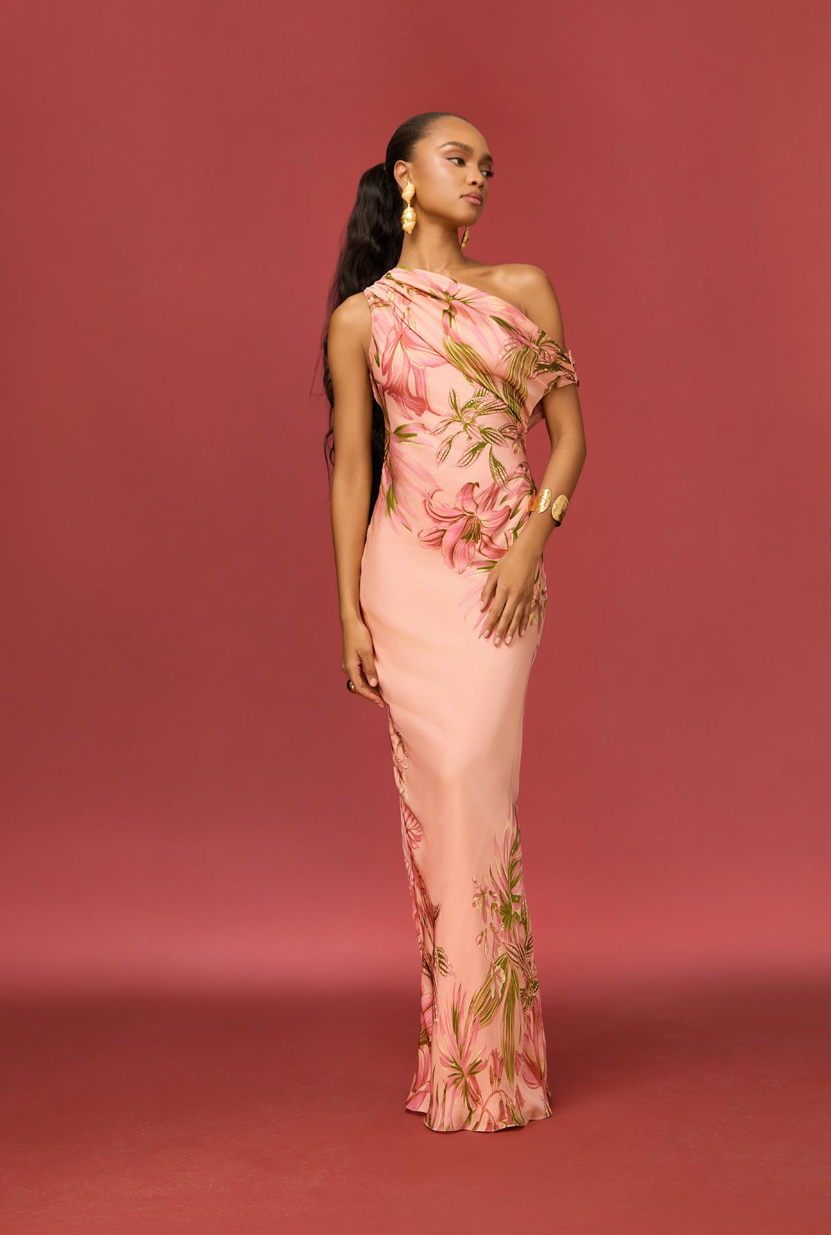 Soft peach tones and fluid botanical movement give the Cain One Shoulder Maxi Dress from the Spring ’26 Collection a warm, luminous presence. Cut in smooth viscose with a pleasing floral print, the silhouette is shaped to sit fitted before cascading into an ankle-grazing maxi length. The one-shoulder drape with a single short sleeve adds sculptural balance, while the side zipper closure offers a seamless finish.