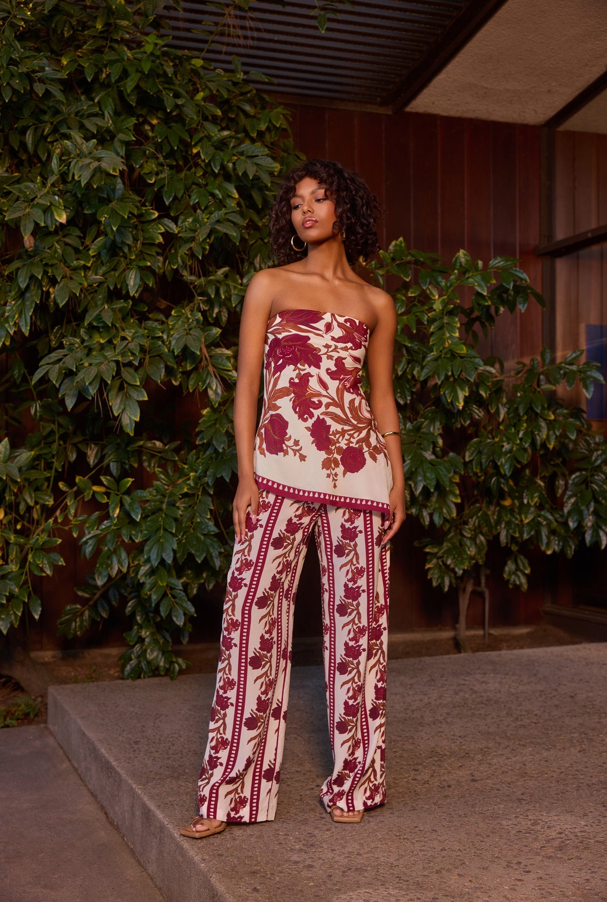 The Maia Pants from Summer '25 offer ease with a refined touch. Crafted in fluid viscose, they are rendered in an ivory and burgundy botanical print. The mid-waist silhouette features an elasticated waistband and a relaxed fit for all-day comfort. Perfectly paired with the Maia Top.