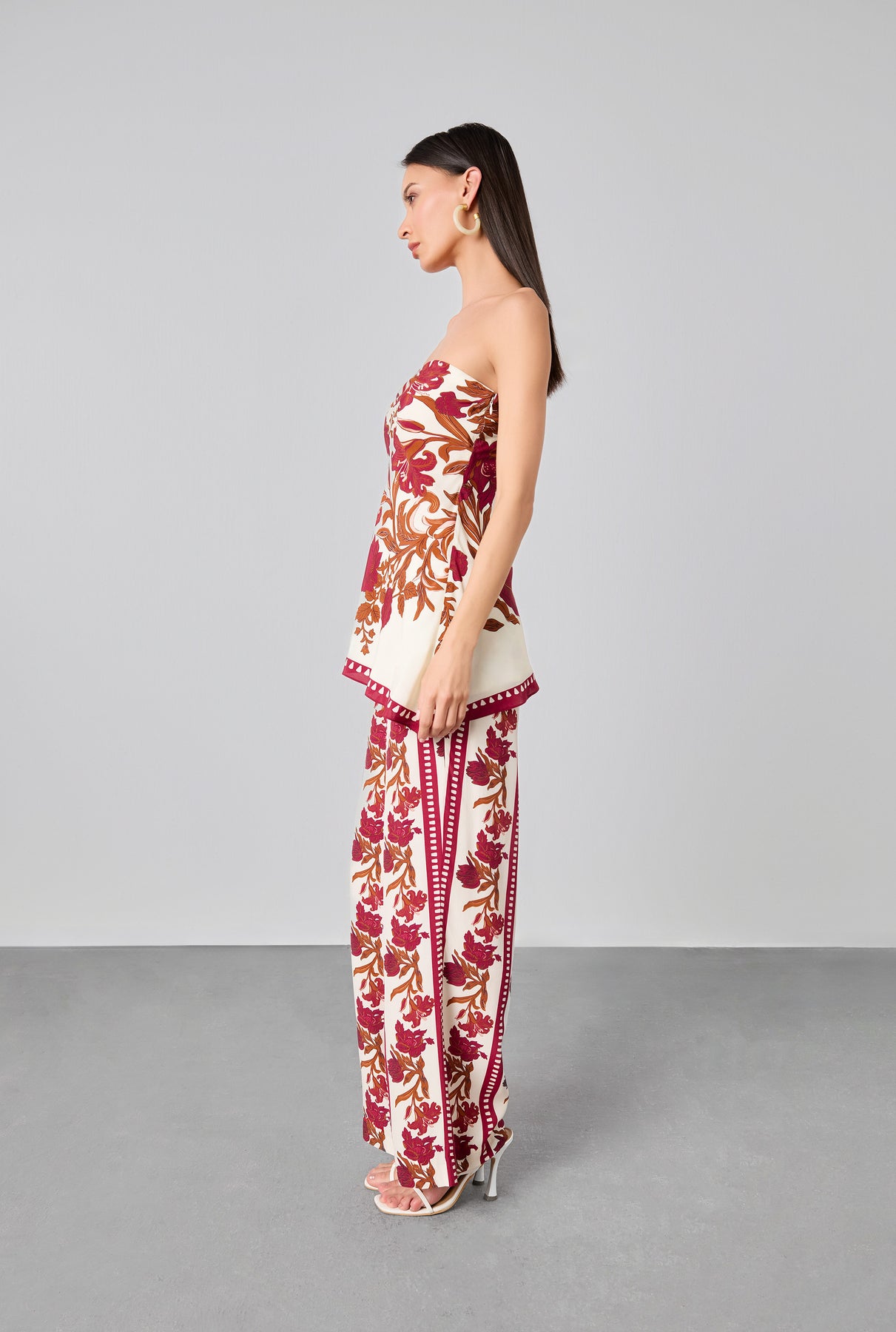 A modern accent for easy summer looks, the Maia Top is from the Summer ’25 collection. Crafted in fluid viscose and finished in an ivory and burgundy botanical print, it has an asymmetrical strapless neckline for a clean, contemporary look. The relaxed fit and side zipper closure ensure ease and comfort, and it is lined for a smooth finish. It pairs beautifully with the matching Maia Pants.