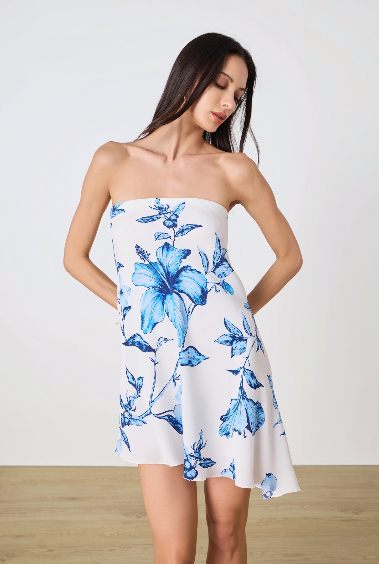 Fresh, floral and a season must-have, the Milo Asymmetric Mini Dress from the Spring ’26 Collection offers a modern take on feminine dressing. Crafted in white and blue floral viscose, the silhouette is cut on the bias for a soft, fluid drape, while the strapless neckline keeps the look minimal and chic. The asymmetric hemline adds a dynamic edge, creating movement with every step. A concealed side zipper and full lining ensure a smooth, comfortable fit.