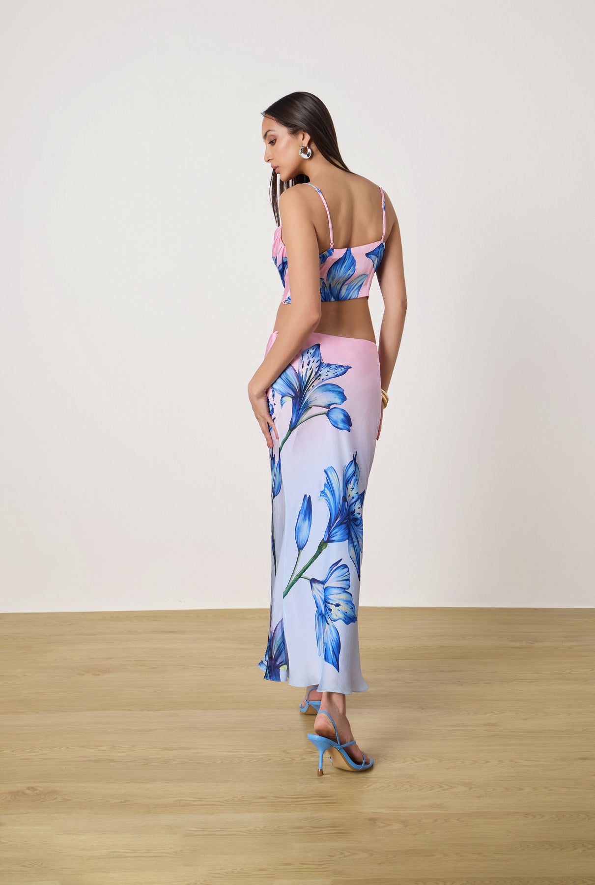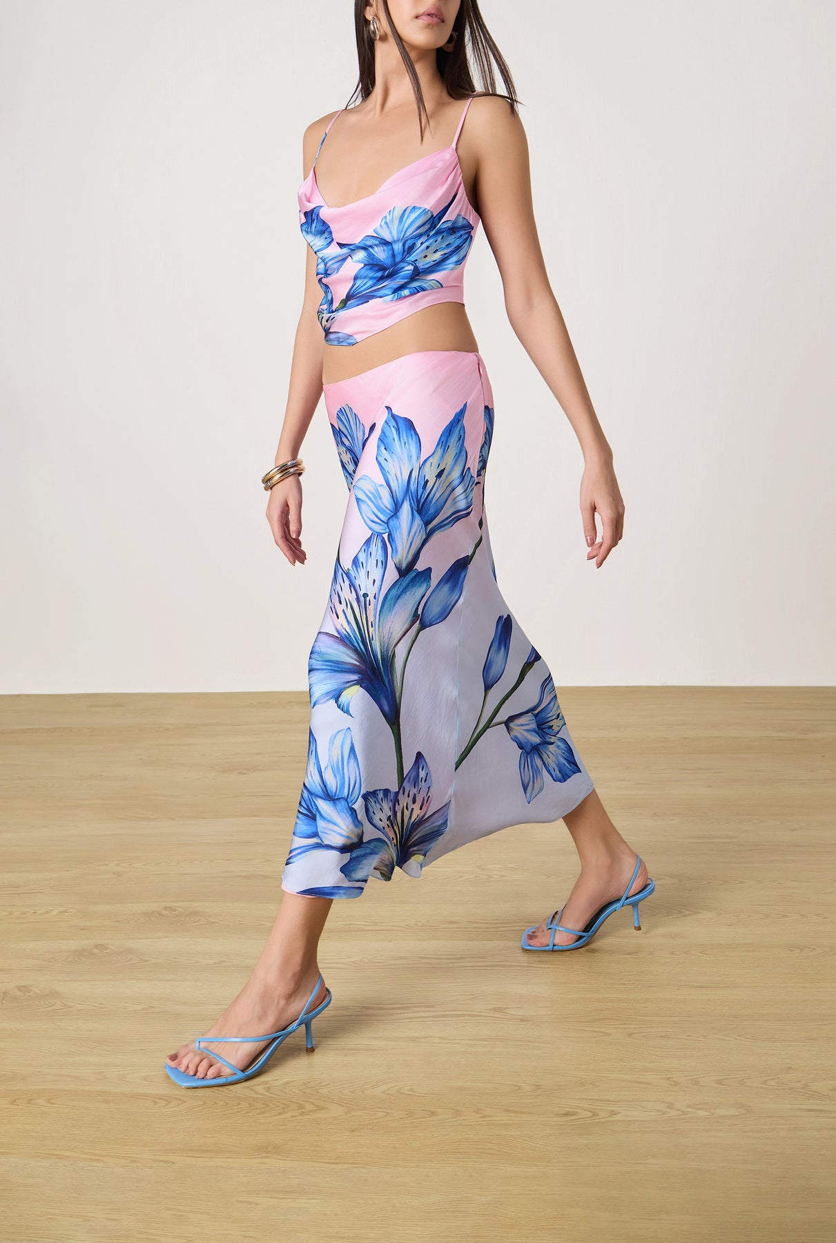Spring-time hues and playful florals bring effortless allure to the Flur Cowl Neck Top from the Spring ’26 Collection. Crafted from fluid viscose in a pink-and-blue floral print, the relaxed silhouette features a softly draped cowl neckline and delicate, thin straps that highlight the shoulders. A concealed side zipper ensures a smooth fit, keeping the finish clean and easy. Best paired with the Flur Midi Skirt for that beachside party-ready look.